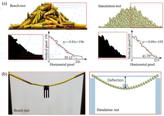 The natural repose angle and deflection of the main stem were calibrated through bench tests and virtual simulation tests, as shown in Figure 7. Each test was repeated three times, and the average value was taken as the result.