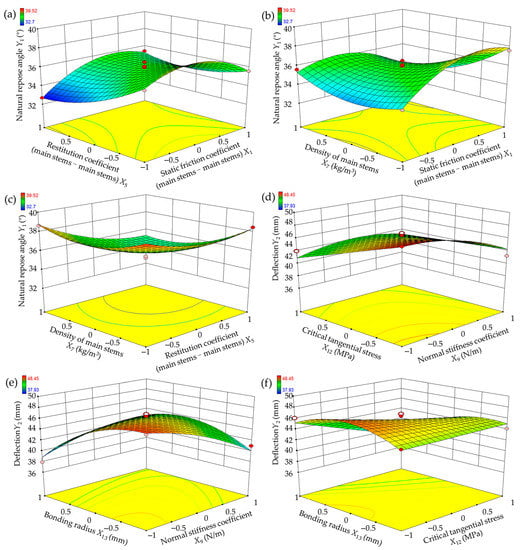 To begin, a test was conducted to examine the contact between the rice main stem and steel. This involved Plackett–Burman screening tests, steepest ascent tests, and Box–Behnken optimization tests, each performed separately. During this phase, parameters such as density, the elastic modulus of the main stems, static friction coefficients between the main stem–main stem, main stem–steel, rolling friction coefficient, restitution coefficient, normal stiffness coefficient, tangential stiffness coefficient, critical normal stress, critical tangential stress, and particle bonding radius of the main stems were determined. These established parameters were then utilized as known quantities to conduct the steepest ascent tests and Box–Behnken optimization tests on various contact materials, thereby determining the discrete element parameters between the main stems and different contact materials.