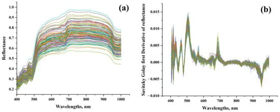 The ROI of the images yielded average spectra. After removing the wavelengths which have noticeable noises at the beginning and end of the spectra, the spectral curves range from 400 to 1000 nm (472 bands), as shown in Figure 2a. Notably, according to Figure 2b, there is a conspicuous increase in reflectance between 460 and 570 nm, the distinct absorbance in the wavelengths at 450, 680, and 950 nm, respectively. The O-H second overtone is at 950 nm. These ROI spectra were subsequently utilized for additional processing.
