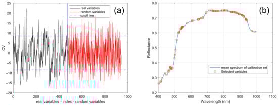 Uninformative variable elimination (UVE) is based on the stability of the variable in modeling to eliminate the variables without information [22]. During the UVE calculation, artificial random variables are added to the spectral matrix, and PLSR models are established. Then, the stability of each variable is calculated by the regression coefficient vector of PLSRs. In this study, the cutoff was set as Equation (6) [23]: