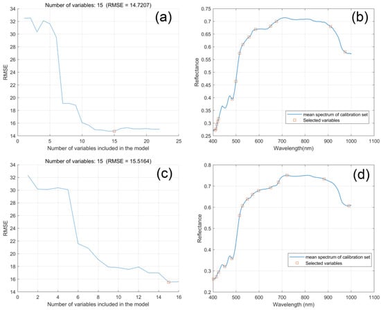 Feature wavelengths selection by SPA. (a) RMSE trend chart of SG–SPA and the minimum RMSE denoted by red square; (b) feature bands selected by SPA with SG-input; (c) RMSE trend chart of SG–UVE–SPA and the minimum RMSE denoted by red square; and (d) feature bands selected by SPA with SG–UVE input.