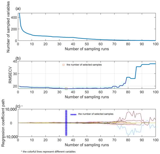 SG–CARS band selection procedure. (a) the change of the number of sampled variables along with the increase of number of sampling runs; (b) the change of RMSECV along with the increase of the number of sampling runs; (c) the change of regression coefficient along with the increase of the number of sampling runs.