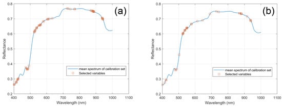 The distribution of the feature bands retained by SG–CARS and SG–UVE–CARS are shown in Figure 6a and b, respectively. Comparing these feature bands, it can be noticed that most of the 35 are also in the 56 feature bands. Amylose has a lot of C–H and some O–H functional groups. Their stretching vibration of the overtones information could be reflected in these feature wavelengths selected. And most of the feature wavelengths are 400–600 nm and 850–950 nm.