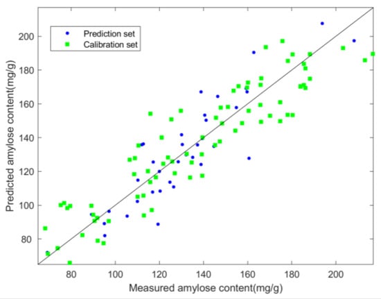 Figure 7 shows the scatter plots of predicted and measured values of amylose content in the lotus seeds of the SPA–PLSR model. The sample points were closely distributed near the regression line; the Rp was 0.89, the RMSEP was 15.154, and the RPD was 2.19. These results indicate that the model was highly effective in predicting the starch content of lotus seeds with good performance.