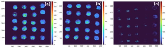 The distribution maps of the amylose content in lotus seeds of different varieties: (a) Guangchang variety; (b) Jianxuan variety; and (c) Xiang variety.