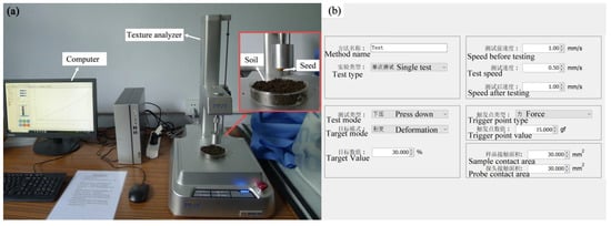 The test procedure is as follows: First, the seeds are fixed onto the probe of the texture instrument so that the flat side of the seeds is in contact with the soil, and the probe of the texture instrument is adjusted to the appropriate height. Then, the probe of the texture instrument is moved downward at a speed of 1 mm/s until the probe compress the soil by 30% of its deformation, and the probe is moved upward. Finally, the curves of force versus displacement and the data are obtained. Three replicate tests are performed for each set of tests.