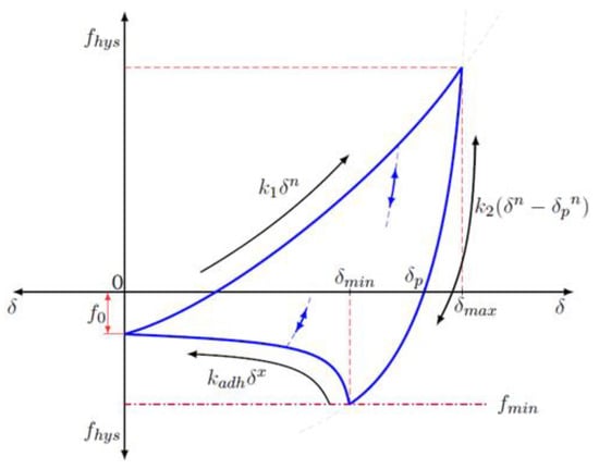In addition, for example, the curve of the normal contact force and displacement between the soil and seed with 25% water content, as well as the loading process, unloading process, and adhesion process of the force of this curve, are similar to the curve in the nonlinear model of normal contact of the EEPA model (f0 = 0), as shown in Figure 10.