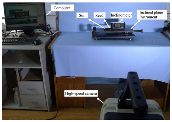 A sketch of the setup for the inclined slide test of soil and seed particles is presented in Figure 7. The test setup consists of a high-speed video camera, a computer, an inclinometer, and an angle meter. The steps of the inclined slide test are as follows: first, fill the square slot of the inclinometer with soil of a certain water content and make the surface soil level. Then, place the maize seed particles statically on the surface of the soil and place the inclinometer horizontally, as shown in Figure 7. Next, slowly lift the inclinometer until the maize seed grain slides off the soil surface. Finally, use a high-speed camera to obtain an indication of the angle meter at the time when the sliding of the maize seed particles on the inclined plane first occurs. Repeat each experiment three times.
