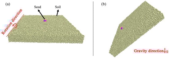 The simulation of inclined sliding uses the calibrated parameters, while the other parameters remain consistent with those used in the actual test. The simulation setup for inclined sliding is shown in Figure 8. The simulation steps are as follows: first, a seed particle is generated on the soil surface with a frontal downward attitude; then, the soil layer is rotated anticlockwise at 10 deg/s until the seed particle slip off the soil. Finally, the angle of inclination of the seed particles as they slip off the soil is calculated. Each set of simulations is repeated three times.