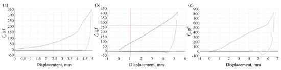 The force-versus-displacement curves for three moisture contents of soil in normal contact with seeds are shown in Figure 9 (where gf is the unit of force equal to the magnitude of the force of gravity on an object with a mass of 1 g). It should be noted that the horizontal axis of the graph represents the change in probe displacement, while the vertical axis represents the magnitude of the contact force between the maize seed and the soil. The maximum negative force in the graph represents the maximum adhesion of the soil to the seed.