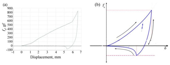 (a) Force versus displacement curves for seed particles in normal contact with soil; (b) curves for the non-linear model of normal contact for the EEPA model (f0 = 0).