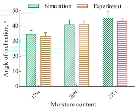 A comparison of the test and simulation results for the inclined slip test is shown in Figure 13. For soils with 15%, 20%, and 25% moisture content, the relative error between the simulation results and the actual test results of the slope test are 4.3%, 0.8%, and 5.4%, respectively. This proves the accuracy of the parameters obtained from the calibration.