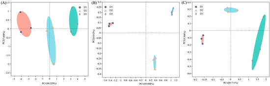 In this study, the differences in starch components in rice under three nitrogen fertilizer levels were analyzed (Table 2). The amylose content (AC) in D1 exhibited significant increases of 2.81% and 7.17% compared to D2 and D3, respectively. Similarly, the amylopectin content (APC) in D1 showed significant decreases of 2.01% and 3.24% compared to D2 and D3, respectively. Additionally, the total starch content (SC) in D1 demonstrated significant decreases of 0.68% and 2.08% compared to D2 and D3, respectively. Notably, as the nitrogen application rate increased, the trend of rice protein content mirrored that of the total starch content, displaying a consistent upward trend. The data of rice eating quality, rice component content and enzymatic activities under three nitrogen treatments were evaluated using principal component analysis (PCA). In the PCA of enzyme activities under nitrogen treatments, the first two principal components (PC1 and PC2) collectively explained 90.229% and 7.60% of the variance in the data, respectively (Figure 1A). In the PCA of rice eating quality under nitrogen treatments, the first two principal components (PC1 and PC2) collectively explained 95.089% and 4.012% of the variance in the data, respectively (Figure 1B). In the PCA of rice component content under nitrogen treatments, the first two principal components (PC1 and PC2) collectively explained 95.711% and 3.566% of the variance in the data, respectively (Figure 1C).