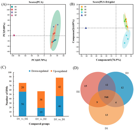 Exploration of multivariate statistical analysis and differential metabolites under three nitrogen fertilizer treatments. (A) PCA score plot illustrating the distribution of samples as per their metabolic profiles. The ellipses of different colors indicate that the "real" samples of this group are distributed in this region with 95% confidence; Exceeding this area indicates that the sample may be abnormal. (B) PLS-DA score plot demonstrating the discrimination between different treatments. In the figure, the greater the degree of separation between the two groups of samples, the smaller the overlap of ellipses of different colors, indicating that the classification effect is more significant. (C) DMs up-regulated and down-regulated in different comparison groups. (D) Venn distribution map depicting the overlapping and unique metabolites among the treatments. Different colors represent different groups, overlapping numbers represent the number of metabolites common to multiple groups, and non-overlapping numbers represent the number of metabolites unique to the corresponding group.