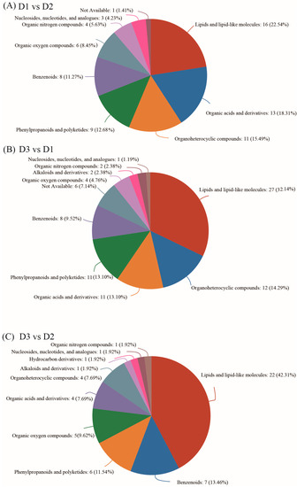 Statistical map of compounds based on HMDB hierarchy (Class). (A) Comparison between D1 and D2 treatments showing the metabolites organized by class, listed in descending sequence of abundance. (B) Comparison between D3 and D1 treatments displaying the metabolites categorized by class, listed in descending sequence of abundance. (C) Comparison between D3 and D2 treatments indicating the metabolites grouped by class, listed in descending sequence of abundance.