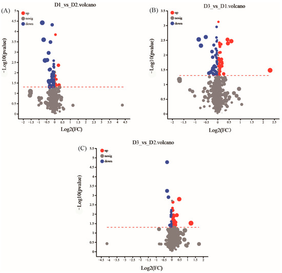 Volcano plot of DMs. Each dot depicts a specific metabolite, with the dot size corresponding to the VIP value. p values were estimated with paired Student’s t-test on Single dimensional statistical analysis. VIP > 1, fold-change = 1, p < 0.05 is a significant difference metabolite. The down-regulated metabolites are on the left side, while the up-regulated metabolites are on the right side. The further to the right or left a point is, the higher significant the differential expression. (A) D1 and D2 treatment comparison (B) D3 and D1 treatments comparison. (C) D3 and D2 treatments comparison.