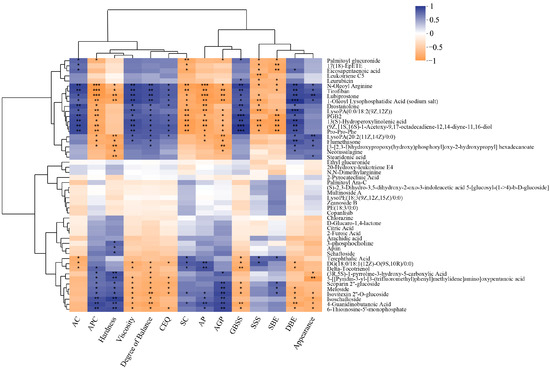 Correlation analysis between rice enzyme activities and DMs, unraveling potential links between enzymatic processes and metabolic regulation in rice. Each cell represents the correlation between two attributes (metabolites and associated features), with different colors representing the magnitude of the correlation coefficient between attributes. * indicates statistical significant at the p = 0.05 level, whereas ** significance at the p = 0.01 level, *** indicates statistical signifificantat the p = 0.001 level.