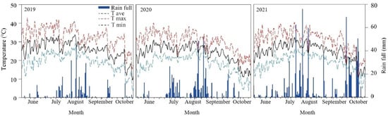 The field experiment was conducted from 2019 to 2021 at the Shenzhou Dry Farming Water Saving Experimental Station of the Hebei Academy of Agriculture and Forestry Sciences (Hengshui, China, 37.91° N, 115.71° E). The experimental site is located in the temperate monsoon climate zone, where high temperatures and precipitation are mainly concentrated in June and July. The rainfall and temperature during the summer maize-growing season are shown in Figure 1. The soil at the station is loam fluvo-aquic, with 12.5 g kg−1 organic matter, 65.8 mg kg−1 total nitrogen, 15.3 mg kg−1 available phosphorus, and 121.9 mg kg−1 available potassium.