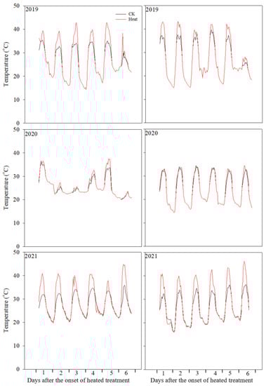 The hourly dynamics of temperature for the nonheated control (CK; black line) and heat treatments (red line) imposed during the lag stage (left), or during the effective-grain-filling period (right).