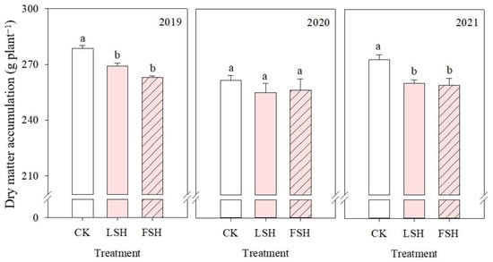 The dry-matter accumulation after silking, as affected by heat stress. Different lowercase letters indicate significant differences at the 0.05 level. CK, the control; LSH, heat treatment during the lag stage; FSH, heat treatment during the effective-filling stage.