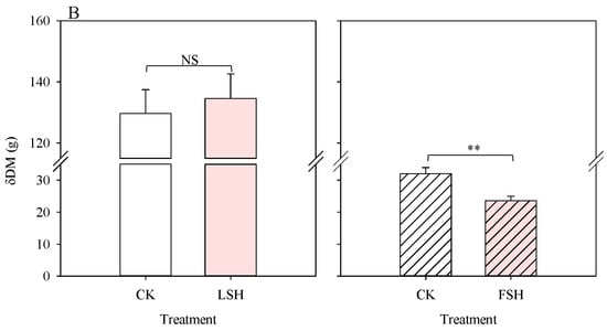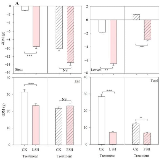 Dry-matter change during the heating process (A) and from the end of heat treatment to maturity (B). δDM, the dry-matter change during the heating process or after heating. CK, the control; LSH, heat treatment during the lag stage; FSH, heat treatment during the effective-filling stage. CK represents the values of the nonheated control during the lag and effective-filling stage, respectively. NS means non-significant. *, **, and *** indicate significant differences at the p < 0.05, p < 0.01, and p < 0.001 probability levels, respectively.