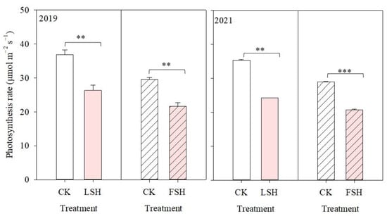 The photosynthesis rate, as affected by heat stress, in 2019 and 2021. CK, the control; LSH, heat treatment during the lag stage; FSH, heat treatment during the effective-filling stage. CK represents the values of the nonheated control during the lag and effective-filling stage, respectively. ** and *** indicate significant differences at the p < 0.01 and p < 0.001 probability levels, respectively.
