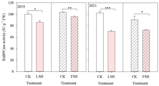 Heat treatment significantly reduced the Pn and relative enzyme activity. The Pn under LSH was reduced by 28.6% and 31.4% compared with CK in 2019 and 2021, respectively. The Pn under FSH was decreased by 26.7% and 28.5%, respectively (Figure 5). Similarly, the RuBPcase activity under LSH was also decreased by 14.1% and 31.2%, and under FSH, it was decreased by 7.5% and 19.7% compared with CK in 2019 and 2021, respectively (Figure 6).