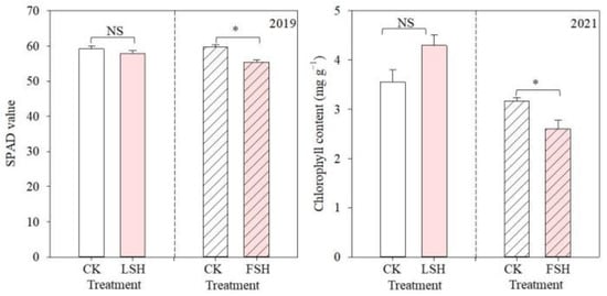 The SPAD value and chlorophyll content, as affected by heat stress, in 2019 and 2021. CK, the control; LSH, heat treatment during the lag stage; FSH, heat treatment during the effective-filling stage. CK represents the values of the nonheated control during the lag and effective-filling stage, respectively. NS means non-significant, and * indicates significant differences at the p < 0.05 probability level.