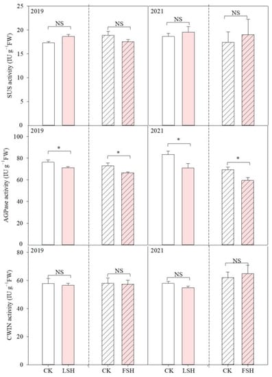 Effects of high temperature on the sucrose synthase decomposition direction (SuS), adenosine diphosphate pyrophosphorylase (AGPase), and cell-wall acid invertase (CWIN) activities in 2019 and 2021. CK, the control; LSH, heat treatment during the lag stage; FSH, heat treatment during the effective-filling stage. CK represents the values of the nonheated control during the lag and effective-filling stage, respectively. NS means non-significant, and * indicates significant differences at the p < 0.05 probability level.