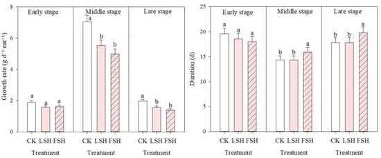 As shown in Figure 9, LSH and FSH did not significantly shorten the duration of the whole-grain filling in this study. LSH and FSH slightly shortened the duration of the early-filling stage, but this was statistically insignificant in both years. The duration of the middle- and late-filling stages under LSH were not changed compared with CK; however, the duration of the middle and late filling stages under FSH was significantly increased compared with CK. The grain-growth rate-per-ear during the early and late stages of LSH was slightly reduced. During the middle stage, the grain-filling rate per ear under LSH and FSH were dramatically reduced, by 21.4% and 29.0%, compared with CK, respectively. LSH and FSH also significantly reduced the grain-growth rate per ear compared with CK during the late growth stage.
