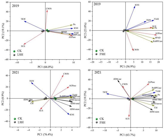 Principal component analysis (PCA) was performed to visualize the relationships between the yield components, Pn, SPAD, or chlorophyll content, and the change in the dry-matter weight (Figure 10). A small acute angle between the loading vectors, and a close correlation between the variables were found. The Pn was located close to the kernel number per ear, AGPase activity, and grain yield. The δDM-TR6 (after heating to maturity) was positively correlated with the grain yield in 2021, indicating that the aftereffect of FSH was positively correlated with the grain yield.