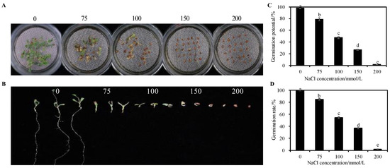 Effects of different concentrations of NaCl stress on seed germination of alfalfa. (A) Germination state. (B) Growth state. (C) Germination potential. (D) Germination rate. Bars superscripted by different lowercase letters indicate significant differences (p < 0.05), mean ± SE.