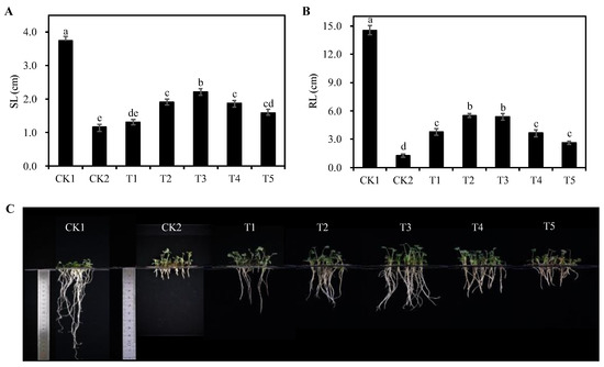 Effects of different concentrations of Cp2 EPS on the seeding length (A) and root length (B) and apparent morphology (C) of salt-stressed alfalfa seedlings. Bars superscripted by different lowercase letters indicate significant differences (p < 0.05), and the error bars were expressed in the form of ± standard error (SE).
