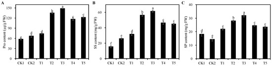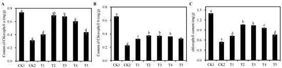 In comparison to the CK1 group, chlorophyll a, chlorophyll b, and total chlorophyll content (Figure 4A–C) of seedlings under the CK2 group were significantly reduced by 57.92%, 65.99%, and 61.72% (p < 0.05), respectively. Compared with CK2 group, all treatment groups from T1 to T5 significantly alleviated the inhibitory effect of salt stress on the chlorophyll content of alfalfa leaves (p < 0.05), among which, the T2 treatment group had the best effect with 122.58%, 65.67%, and 98.13% increase in chlorophyll a, chlorophyll b, and total chlorophyll content, respectively, followed by the T3 treatment group, which was not significantly different from the T2 treatment group (p > 0.05).