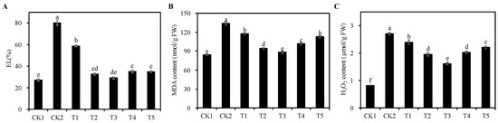 In comparison to the CK1 group, the CK2 group exhibited a significant increase in the EL, MDA, and H2O2 content of alfalfa seedlings (p < 0.05), with respective increases of 194.81%, 58.70%, and 229.27% (Figure 5). Conversely, the EL, MDA, and H2O2 content of alfalfa seedlings under T1 to T5 treatment groups were significantly reduced in comparison to the CK2 group (p < 0.05). Notably, the T3 treatment group was the most effective, with the EL, MDA content, and H2O2 content reduced by 63.58%, 33.99%, and 40.25%, respectively (p < 0.05). These results show that an appropriate concentration of Cp2 EPS could effectively reduce cell membrane oxidative damage and protect cell structure stability under 75 mmol/L NaCl stress.