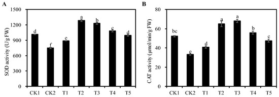SOD and CAT are important antioxidant enzymes that protect cells from oxidative damage by eliminating excessive reactive oxygen species from plants. The SOD and CAT activities of alfalfa seedlings were significantly decreased in the CK2 group as compared to the CK1 group (p < 0.05). Compared with the CK2 group, the SOD and CAT activities of seedlings treated with T1 to T5 were significantly increased (p < 0.05), and reached their maximum values under the T2 and T3 treatment groups, with an increase of 71.63% and 105.25%, respectively (p < 0.05) (Figure 7). The results show that the application of certain concentrations of Cp2 EPS could improve the antioxidant enzyme activity to alleviate the salt stress on alfalfa seedlings.