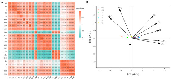 Heatmap of correlation between germination, growth, and physiological indicators (A). The image show Spearman correlation and the values in the grid represent correlation coefficients (r values). The red color indicates a positive (0 < r < 1.0) correlation and the green color indicates a negative (−1.0 < r < 0) correlation. GP, germination potential; GR, germination rate; GI, germination index; SL, seeding length; RL, root length; SFW, seedling fresh weight; RFW, root fresh weight; SDW, seedling dry weight; RDW, root dry weight; ARD, average root diameter; RSA, root surface area; RV, root volume; Chla, chlorophyll a; Chlb, chlorophyll b; ChlT, total chlorophyll; EL, electrolyte leakage; MDA, malondialdehyde; H2O2, hydrogen peroxide; Pro, proline; SS, soluble sugar; SP, soluble protein; SOD, superoxide dismutase; and CAT, catalase activity. Principal component analysis of physiological indicators (B). The percent total variance is shown for PC1 and PC2 in parenthesis in the axis. PCA, principal component analysis; PC1, principal component 1; and PC2, principal component 2.