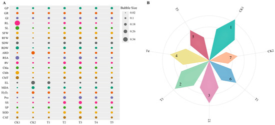 Comparison of the classification of germination, growth, and physiological indicators of alfalfa under different treatments (A). Comprehensive evaluation of the growth characteristics of alfalfa under salt stress with different concentrations of Cp2 EPS treatments (B). CK1 means distilled water; CK2 means 75 mmol/L NaCl; T1, T2, T3, T4, and T5 mean at 75 mmol/L NaCl stress solution added 0.5, 1.0, 1.5, 2.0, and 2.5 g/L Cp2 EPS treatment.