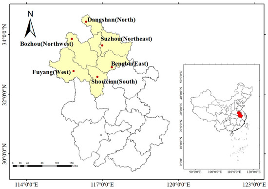 All data related to temperature were obtained from the China Meteorological Data Sharing Service System (CMDC, http://data.cma.cn/, accessed on 27 January 2021), including annual, monthly, and daily temperature data. Six representative weather stations were selected in the Huaibei Plain of Anhui Province, China: Bengbu (Bb), Fuyang (Fy), Shouxian (Sx), Dangshan (Ds), Suzhou (Sz), and Bozhou (Bz). (Figure 1). Wheat production data for Fuyang, Bozhou, Suzhou, and Bengbu were only available from 1999 to 2020.