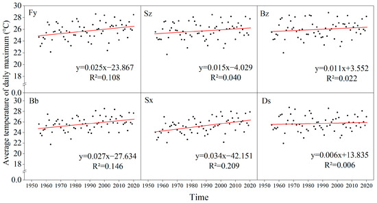 Variation of the average temperature of the daily maximum between flowering and maturity of wheat from 1955 to 2020. Note: Red lines represent fitting of the average temperature of the daily maximum and time. Black dots represent average temperature of the daily maximum, respectively.
