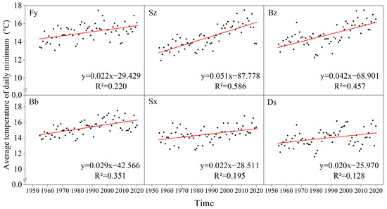 Variation of the average temperature of the daily minimum between flowering and maturity of wheat from 1955 to 2020. Note: Red lines represent fitting of the average temperature of the daily minimum and time. Black dots represent average temperature of the daily minimum, respectively.