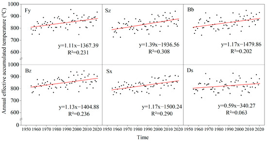Variation of annual effective accumulated temperature between flowering and maturity in wheat from 1955 to 2020. Note: Red lines represent fitting of the annual effective accumulated temperature and time. Black dots represent annual effective accumulated temperature, respectively.