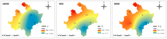 The Kriging method is one of the most widely used spatial interpolation methods. Compared with the inverse range-weighted interpolation (IDW) method, the Kriging method considers the spatially related attributes of descriptive objects in the process of data meshing, which makes the interpolation results more scientific and closer to the actual situation. By giving the interpolation error (Kriging variance), the reliability of interpolation becomes clearer [23]. ArcGIS Desktop 10.7 software (Environmental Systems Research Institute (ESRI) Inc.; Redlands, CA, USA. www.zhanshaoyi.com/15142.html, accessed on 2 October 2022) was used to analyze the spatial distribution of temperature data and to determine the probability of thermal stress occurrence in the Huaibei Plain by quantifying temperature data.