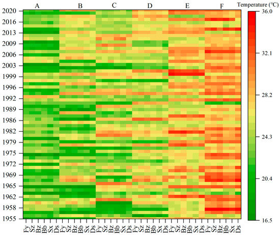 Distribution of the average temperature of the daily maximum in six phases from 1955 to 2020. Note: Going from green to red denotes increasing temperature; green color denotes minimum temperature; reseda color indicates mild heat stress; yellow-green color denotes maximum medium temperature; orange color indicates severe heat stress; and red color denotes maximum temperature. A, B, C, D, E, and F denote the six developmental phases of the wheat crop (A, phase i; B, phase ii; C, phase iii; D, phase iv; E, Phase v; F, Phase vi) across six sites, i.e., Shouxian, Bengbu, Fuyang, Suzhou, Bozhou, and Dangshan, on Huaibei.