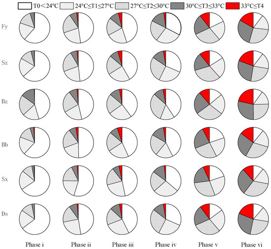 The probability pattern of the occurrence of post-flowering high temperatures was similar across the six sites (Fuyang, Suzhou, Bozhou, Bengbu, Shouxian, and Dangshan). From phase i to phase vi, the probability of occurrence of T0 ≤ 24 °C continuously decreased, and for T4 ≥ 33 °C, it gradually increased. Further, T0 ≤ 24 °C mainly occurred during phases i and ii, 30 °C ≤ T3 ≤ 33 °C and 33 °C ≤ T4 mainly occurred in phases v and vi (Figure 8). In addition, extremely high temperatures, i.e., ≥30 °C and 33 °C, also occur during phases i, ii, iii, and iv, with a significantly higher probability of occurrence of these temperature extremes for phase iii than that for phases i, ii, and iv.