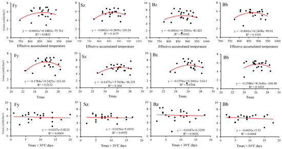 Analyzing the relationship between wheat grain yield and post-flowering effective accumulative temperature, daily mean maximum temperature (Tmax), and the days of Tmax > 30 °C for 22 years in the Huaibei Plain (Figure 9), the yield per unit area of wheat ranged from 2 to 8 t/hm2. The relationship between wheat yield, effective accumulated temperature, and Tmax showed an increasing and then decreasing trend as the temperature reached a certain threshold. For example, grain yield increased with increasing effective accumulated temperature up to about 860 °C and then decreased as accumulated temperature exceeded 860 °C. The higher the Tmax threshold, the more significant grain yield losses were observed. Therefore, we speculate that the effective accumulated temperature of 860 °C d and Tmax of 26 °C may be the temperature threshold for normal grain filling of wheat, beyond which yield loss of wheat may occur. In addition, the analysis suggests that the grain yield decreases with increasing temperatures (Tmax > 30 °C).