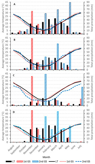 During the 1st GS, the average temperature pattern from September to December was slightly lower compared to the long-term data for all locations (Figure 2). Regarding precipitation, in the 1st GS, the average precipitation amount was lower for all locations with respect to the long-term data. However, exceptionally, only in November, the precipitation was higher for all locations compared to the long-term data. For the 2nd GS, the monthly average temperature data were similar to long-term data at BGL, BLK, and HRT, but in HLM, the monthly average temperature data were slightly lower than the long-term values. The precipitation amount was higher in the 2nd GS for all locations compared to the long-term data and the 1st GS. Therefore, the months of January, March, and May received higher precipitation at BGL, HRT, and BLK, respectively, compared to the long-term. However, in HLM, higher precipitation was recorded in January and July compared to the long-term data and the other locations. On average, BGL was the wettest among all locations, followed by HRT in the 2nd GS, compared to BLK and HLM.