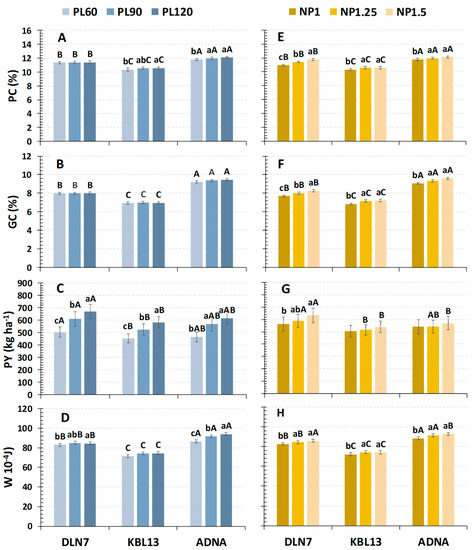 Table 5. Results of the ANOVA on protein concentration (PC), protein yield (PY), gluten concentration (GC), dough strength (W), starch content (ST), starch yield (STY), amylopectin concentration (AP), and amylose to amylopectin ratio (AM:AP). The main effect of the growing season (GS), location (L), nitrogen to phosphorous ratios (NP), phosphorus (PL) fertilization, and varieties (Gen), and their first-order interactions, are reported.