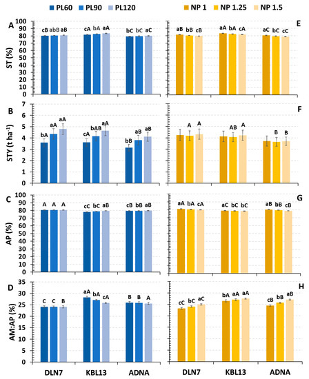 The PL and NP interaction with Gen significantly affected starch concentration, amylopectin concentration, and AM:AP (Figure 5). The starch concentration values increased by 0.72%, 1.92%, and 2.04% at DLN7, KBL13, and ZDNA, respectively, as PL increased from PL60 to PL120 (Figure 5A). Similarly, starch yield strongly increased by 33.70% (4.8 t ha−1), 28.42% (4.6 t ha−1), and 30.88% (4.11 t ha−1) at DLN7, KBL13, and ZDNA, respectively, after the application of PL120 compared to PL60 (Figure 5B). Furthermore, amylopectin concentration increased by 1.94% and 0.3% at KBL13 and ZDNA, respectively, as PL increased from PL60 to PL120, but amylopectin concentration showed no response at DLN7 under the PL treatment (Figure 5C). Additionally, AM:AP at DLN7 and ZDNA showed no response to PL treatment, but AM:AP decreased significantly by 8.5% at KBL13 after the supply of PL120 compared to PL60 (Figure 5D). On the contrary, starch concentration decreased significantly under NP treatment, by 2.29%, 1.65%, and 2.26% at DLN7, KBL13, and ZDNA, respectively, as NP increased from NP1 to NP1.5 (Figure 5E,F). Additionally, NP treatment did not influence starch yield in any of the varieties (Figure 5E,F). Furthermore, amylopectin concentration significantly decreased by 1.37%, 0.78%, and 2.1% at DLN7, KBL13, and ZDNA, respectively, at the highest NP ratio compared to the lowest NP ratio (Figure 5G). Interestingly, AM:AP significantly increased by 7.25%, 3.77%, and 10.36% at DLN7, KBL13, and ZDNA, respectively, as NP increased from NP1 to NP1.5 (Figure 5H).