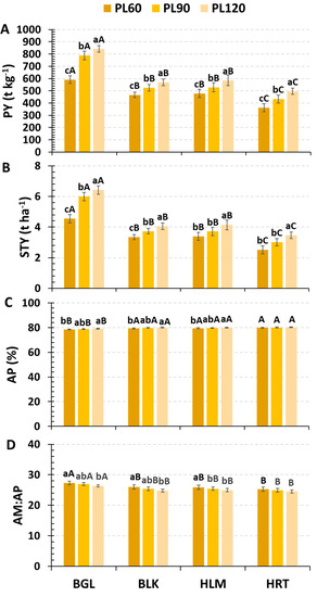 The PL interaction with L needs to be further analyzed. Although protein concentration, gluten concentration, and starch concentration were not significantly affected by PL application for all locations (Figure 6), W, protein yield, starch yield, amylopectin concentration, and AM:AP showed significant increases with PL application at all considered locations. W significantly increased as PL increased from PL60 to PL90 at BGL, BLK, and HLM, but no further significance was detected between PL90 and PL120. However, W was not influenced in HRT under the PL treatment. Moreover, the data showed that as PL increased, protein yield and starch yield significantly increased. The protein yield increments were 44.43%, 22.08%, 22.24%, and 37.40%, and starch yield increments were 42.21%, 22.1%, 22.23%, and 37.6%, in BGL, BLK, HLM, and HRT, respectively, from PL60 to PL120 (Figure 6A,B). Furthermore, amylopectin concentration increased by 0.76%, 0.97%, and 0.71% at BGL, BLK, and HLM, respectively, with the highest PL compared to the lowest PL. However, amylopectin concentration showed no response at HRT under the PL treatment (Figure 6C). Lastly, the results showed that as the PL rate increased, the AM:AP value was significantly reduced, by 3.66%, 4.7%, 3.42%, and 2.87%, in BGL, BLK, HLM, and HRT, respectively. However, the reduction value at HRT was not statistically significant (Figure 6D).